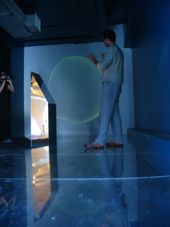 A "tunnel" connects two identical spaces in which images of the audience are projected and distorted. The visitor swipes a finger over a specified surface, leaving a genetic trace. While doing so, the visitor's image is captured and presented in conglomeration with the face of another visitor. The recognizable faces are juxtaposed and become distorted. When another visitor passes through the tunnel, the facial images are again disturbed and altered, fractured into particles and waves.
